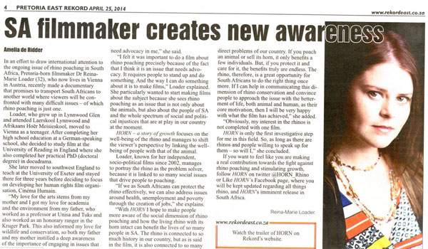 Illegal rhino poaching is the theme of a movie made by Reina-Marie Loader. She tells Naomi Meyer about Horn.