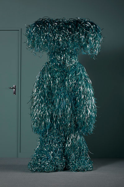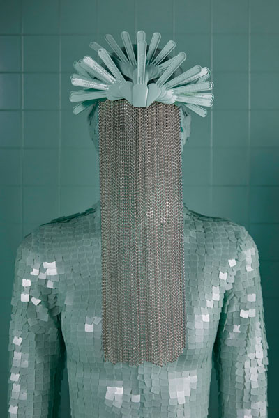 “Met ‘Sluierdans’ wou ek Huis+Hou+Ding se spirituele tema ondersoek. Deur algemene huishoudelike objekte op ander maniere te gebruik, verander die betekenis van die objekte. Roomyslepeltjes word ’n kroon, en badpropkettings ’n sluier. Die kroon en sluier is ’n mengsel van Westerse godsdiens en Afrika-ritualistiese ikonografie, ” vertel Anna. (Foto: verskaf)