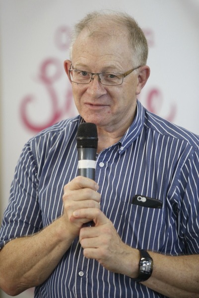 Danny Titus, uitvoerende direkteur: kultuur van die ATKV, hou ’n tydskrif vas waarop die tannies glimlag.