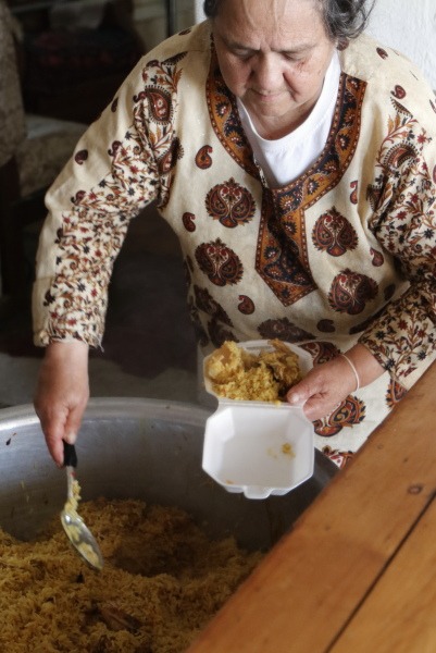 Die Moslemkalender is nie dieselfde as die Westerse kalender nie. Hier is tannie Koelsoem besig om kos uit deel tydens die Nuwejaarsfees. Enigeen wat wou, kon gewoon inloop en kom kos haal. Dié foto is op 2 Oktober 2017 geneem.