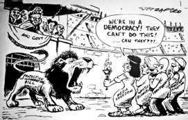 Rooi en wit baniere, pamflette, T-hemde. Die vergaderplek is ’n stampvol ou boekwinkel skuins agter die parlement. Onder die teenwoordiges is ’n minister, ’n oudminister wie se afdanking in polemiek gehul is, ’n professor in grondwetreg, ’n imam, ’n verteenwoordiger van Cosatu en een van die Menseregtekommissie, asook ’n spotprent-tekenaar wat tans met twee aanklagte deur die President te kampe het. Soos wat die eerste spreker agter die podium inskuif, volg ’n geskarrel om die SABC, e-TV en ander uitsaaiers se mikrofone te skuif. En nog joernaliste met opgerolde notaboekies, bandopnemers en swaar kameras peul om die pilare en by die deure uit. Dit ruik soos revolusie.