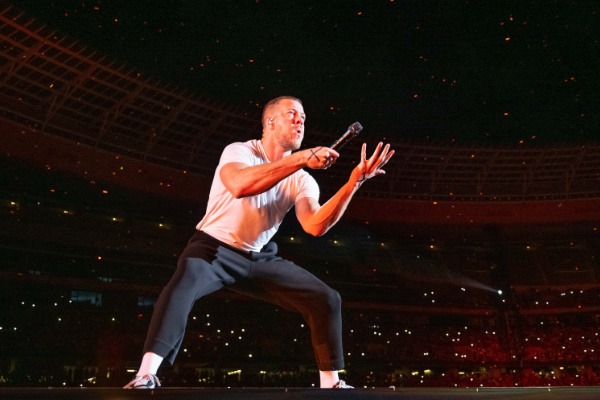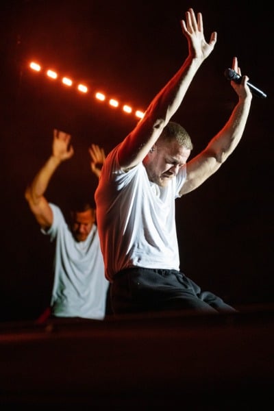 Dan Reynolds is die spil waarom alles draai. Hy vertoon groter in lewende lywe en mors geen tyd om uit te loop op die verlengde verhoog tussen die skare in nie. Dis ’n see van springende en skreeuende ondersteuners. Iemand gooi ’n Suid-Afrikaanse vlag op die verhoog en Tafelberg weergalm toe hy dit om sy skouers drapeer.