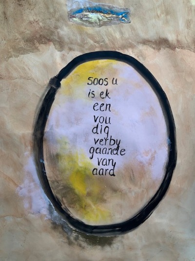 bewussyn is ’n metafoor. wat is “metafoor” ? die gelyktydigwees van omvorming na fatsoen van parallelle werklikhede in die vryval van ondenkbare vergelykings. metafoor is die voortdurende getyestoot van die onkenbare geboortesee teen die kus van die rasionele. die lewe in resonansie en implikasie. (en ritme). dit is die wilde ondertoon wat die botoon aanmekaar omdop om die broek te probeer uittrek. maar soos die dans word dit geaktiveer slegs omdat daar “’n wysie” is. en wanneer jy nié dans nie ? waar is dit dan ? is die soeke nie juis om te kan dans sonder dat daar ooit enige musiek of selfs die droom van oempapa was nie …