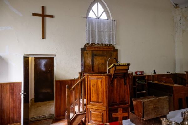 In die een hoek staan ’n outydse orreltjie en teen die mure hang talle foto’s van die vroeë aankomelinge