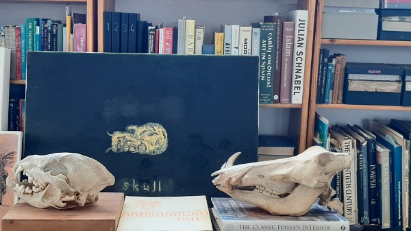 - Die herhalende skedel, met verwysing na Hans Holbein die Jonger se verwronge anamorfose soos uitgevoer in Die ambassadeurs (1533)