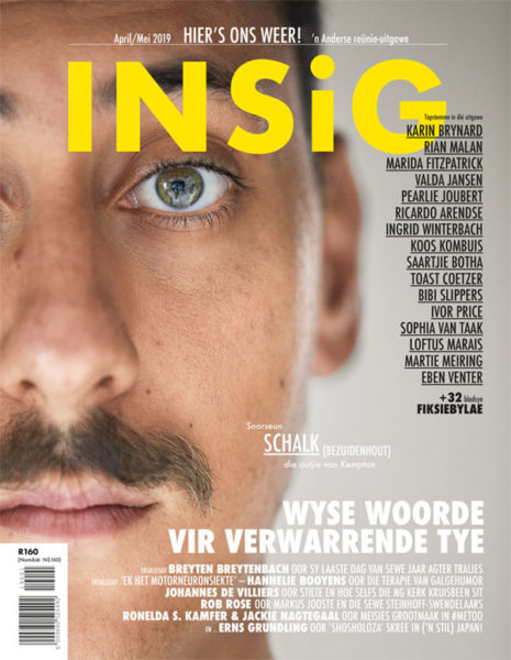 Vir die 2019 Insig was die groot vraag wat sluit ons in. Die 80’s en vroeë 90’s se volledige stelle tydskrifte was (vir ons) onbekombaar en met net twee mense in die destydse “span” haas onmoontlik. Ook sou dit in vergelyking met die later jare se tydskrifte ’n geval wees van appels en pere vergelyk – die styl het te veel verskil. Daarom het ons besluit om van 1999 af te werk – toe die tydskrif meer van ’n leefstylrigting begin inslaan het as ’n menings- en leefstyltydskrif. Ons kon ook werk met ’n spesifieke tydperk: 1999 tot 2019 – 20 jaar.