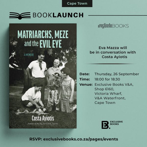 Eva Mazza will be in conversation with Costa Ayiotis on Thursday, 26 September at 18:00 for 18:30 at Exclusive Books, V&A Waterfront, Cape Town.