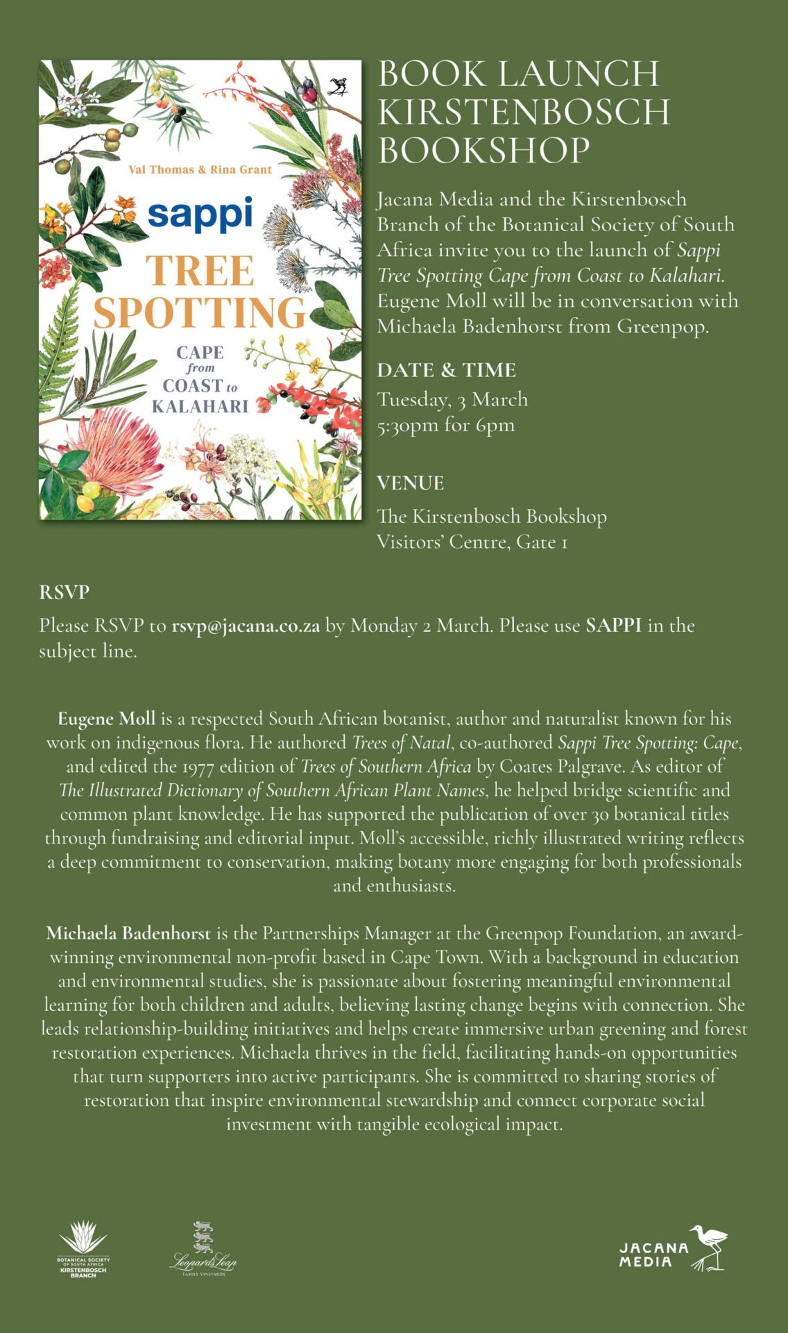 Come join us at the launch of Sappi tree spotting Cape: from coast to Kalahari on Tuesday, 3 March at the Kirstenbosch Bookshop.