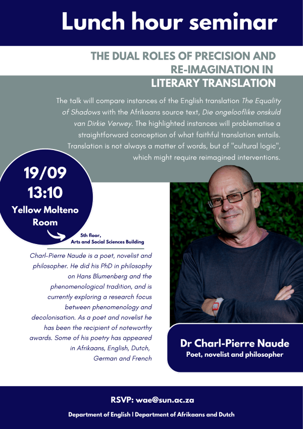 Wordsmith Charl-Pierre Naude delivers a talk titled “The dual roles of precision and re-imagination in literary translation” relating to The equality of shadows, his English translation of his debut novel Die ongelooflike onskuld van Dirkie Verwey.