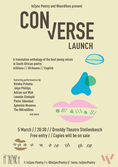 Come join InZync for our first event of 2018 as we publish the long-awaited ConVerse, a collection that showcases some of the best new voices in South African poetry in translation, including Koleka Putuma, Jolyn Phillips, Sindiswa Busuku-Mathese, Nathan Trantraal and Mbongeni Nomkonwana. Original poems in Xhosa, Afrikaans and English stage courageous conversations dealing with death, desire, tradition and alienation. When these poems move through the cycles of translation, new meanings emerge and surprising connections are forged as the poems begin to speak in multiple tongues.