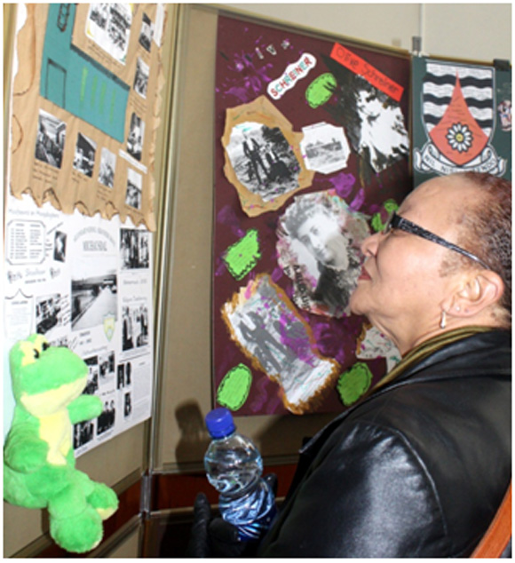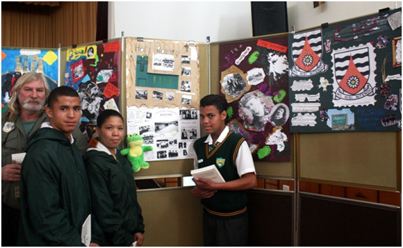 Left to right: Basil Mills with Nathan Flynn, Lorenda Pieters and Jerome Peters standing on either side of their representation of the heritage of Cradock. The poster depicts the role of the Holy Rosary Convent.