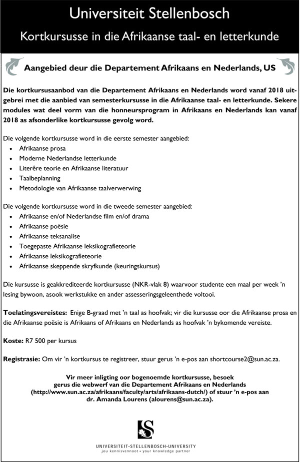Beste dr Mouton, stuur asseblief 'n e-pos aan dr Amanda Lourens by alourens@sun.ac.za vir verdere inligting.