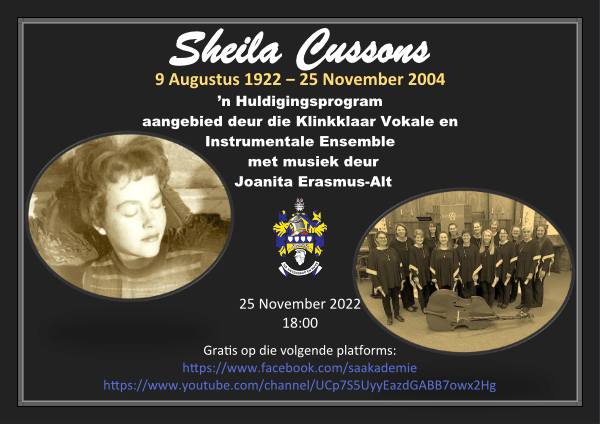 Die digter Sheila Cussons sou op 9 Augustus vanjaar 100 jaar oud geword het. As huldiging het Joanita Erasmus-Alt, ’n lid van die SA Akademie, ’n keur uit Cussons se gedigte getoonset. Hierdie siklus is deur die Klinkklaar Vokale en Instrumentale Ensemble opgeneem en word op 25 November (die 18de herdenking van Cussons se sterfjaar) op die SA Akademie se Facebook- en YouTube-blad uitgesaai. Die opnames word vergesel deur beeldmateriaal bestaande uit foto’s van Cussons en kunswerke deur haar.