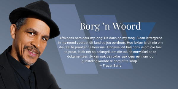 Frazer Barry se liefde vir Afrikaans is aansteeklik. “Afrikaans bars deur my long! Dit dans op my tong! Slaan lettergrepe in my mond voordat dit land op jou oordrom. Hoe lekker is dit nie om die taal te praat en te hoor nie!” Hy beskou dit as ’n wonderlike voorreg om die beskermpersoon van die WAT se Borg ’n Woord-projek te wees, aangesien die WAT Afrikaans in sy wydse omvang dokumenteer. “Alhoewel dit belangrik is om die taal te praat, is dit net so belangrik om die taal te ontwikkel en te dokumenteer. Jy kan ook betrokke raak deur een van jou gunstelingwoorde te borg of te koop.”