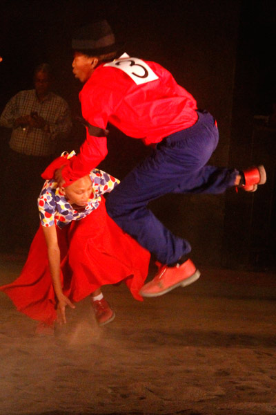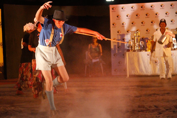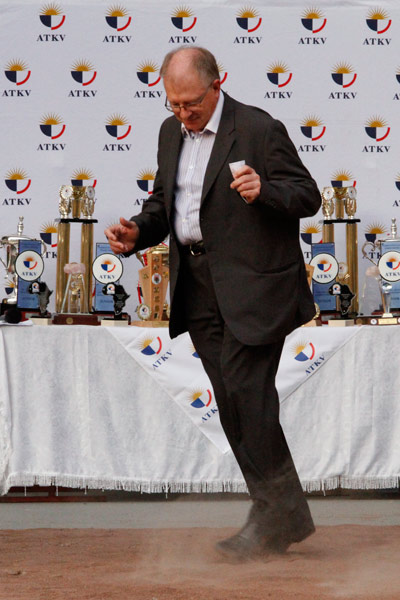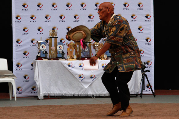 Elias P Nel, organiseerder van die rieldanskompetisie, wys met die intrapslag hoe dit gedoen word.