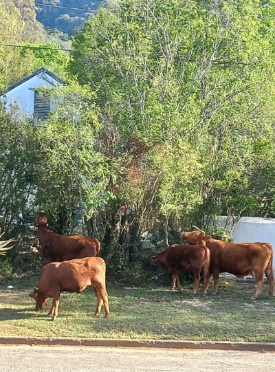 Beeste wat op die sypaadjie voor Paulet-huis wei, is ’n alledaagse gesig.