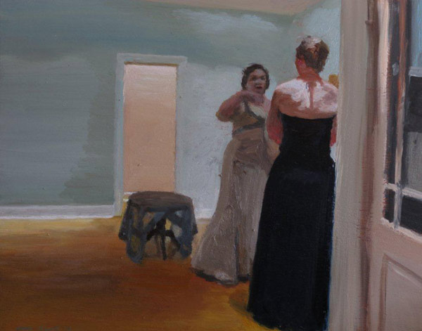 Here I have depicted two women deeply involved in an intimate conversation, unaware of being observed. The pair are fitted with spectacular evening wear, and in an interior stripped bare to the essence (sans paintings or mirrors on the wall) to emphasize the symbolic power of the open doorway and the delicate decorative table laden with a see-through gauze tablecloth. The actual incident was a moment captured by camera during the aftermath of the wedding of a close friend (and colleague, namely Sandra Hanekom), in a private audience with her newly-acquired sister-in-law, and eventually distilled in painterly terms in the studio. As in some of my other paintings, coming-of-age rituals and rites of passage (particularly of women, as in this case) receive a heightened personal significance by the intimate and off-beat treatment of the subjects. The body language says it all (it is a ‘dance’, as it were, of two minds intertwined in conversation).