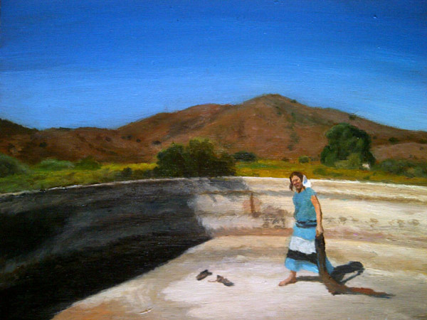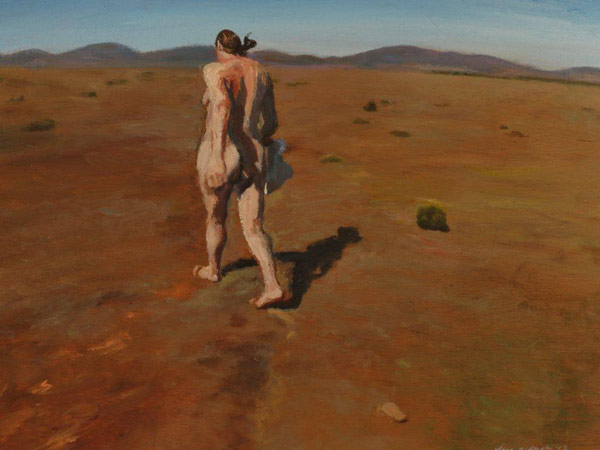Here I am seen walking away from the viewer-voyeur, not nude, but naked, emphasized by my wearing slip-on shoes. I also carry a kappie in one hand, an antique piece of head-wear known to have been used for practical reasons all over the Western world by pioneer women in the last two centuries, but also a particular symbol of my Afrikaner heritage. It is a piece of headgear I like to sport in self-portraits that deal with gender and identity issues. The 'plain' is a farm in Albertinia, where I have both family and close friends, and the meaning of the wind blowing through my hair is similarly potent to that of water encompassing the flow of my lone being as I experience the elements at first hand, and then interpret the experience thereof in terms of brushwork and colour. The plain is meant to be desolate, windswept, save a few lone bushes and the line of hills on the horizon, heightening the sense of this as an 'alone-with-oneself' existential experience (a concept simply explained by the following idea: no-one can take a bath on your behalf; likewise, no one can take a walk in the wind on your behalf).