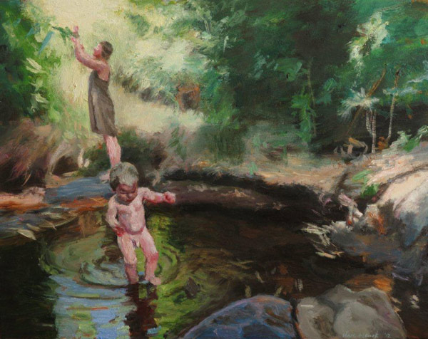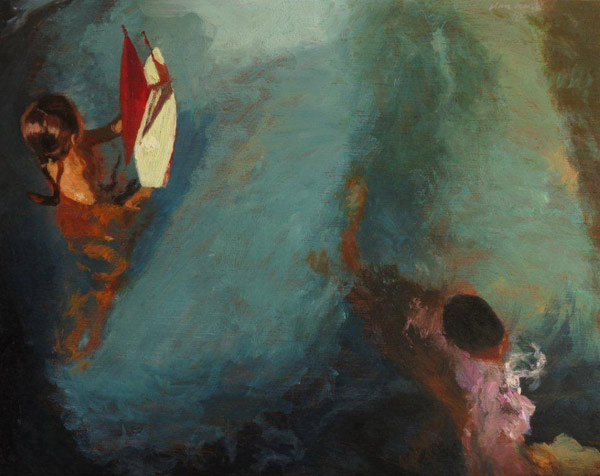 I have depicted my daughter and son immersed in water, one partly above, and one almost entirely below the surface of the water, enveloped by the green and blue sparkling hues and veiling qualities of ripples formed by the movement of their play. The little girl is holding an antique toy yacht with bright red sails to liven the palette with an undeniable complimentary focal point in the form of a vivid visual 'trophy' around which all this movement pivots.