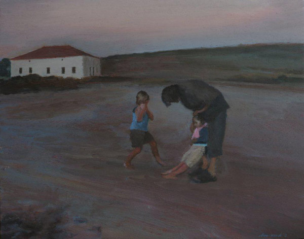 I am the voyeur-observer here; the odd-one-out; the painter that records what she sees (a gentle moment in the life of a family) for posterity. The fleetingness of time is unbelievably marked considering that the incident I render took place several years ago, when my children were ever so little as yet. They display very pert personality differences, clear from their body language towards each other and their father. (Family dynamics is a favourite and subtle theme running through my oeuvre over twenty years). Their father (painter Johann Louw) is demonstrating subtle protective favouritism (even if unintentional) towards the daughter who seeks his attention by her trustingly deep lean against his body, and the son is at this young age already perched to rebel against the father and the sister in a typical, playfully aggressive boxing position – an acute visual summary of the differences between his overall nature and hers.