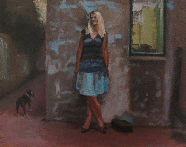 This is the location (on Piket-bo-berg) of a joint family-holiday spent last X-mas, to which Anthea generously invited me for a working holiday (to paint for pleasure) and included my family as well as my pets on the guest list. My friend, the painter Anthea Delmotte, is seen here posing for me in the presence of my pets, one of which is portrayed on the left in the shadow of the wall (Mika is my Boston terrier). Anthea (a great animal-lover) is seen by me interacting with both them and me, the observer she looks in the eye. Here also, the mood is set by the fading light of falling day, and the layers of paint peeling off the wall are symbolic of the layers and evolution of our friendship and professional affiliation set against the passing of time.
