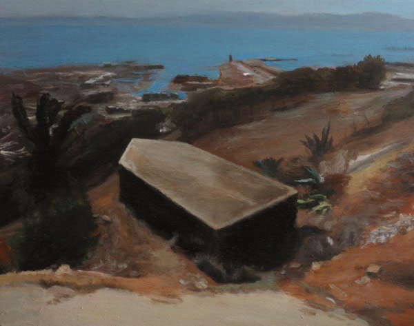 Yet again, the scene is set as a view from the site of the Noon gun (also see “The hills of Anacapri / Site of, and view from, the Noon gun (Cape Town)” 2012 in this series). This time the expanse of Table Bay is fully present, from left to right, including the mountainous profile of the other side of the bay. The wind is represented as lashing about in the tumultuous movement of the palm-tree leaves, and in the sideways-lean of the famous alien pines on the slopes of Lion's Hill. The coffin-like shape in the foreground, reminiscent of a sarkofagus from ancient times on the one hand, and on the other of the bow of a floating vessel, is in actual fact the representation of a military structure built for defence purposes during the Second World War, and takes centre stage in this pictorial representation of the destructive abrasiveness of wind, as of human endeavour (particularly war).