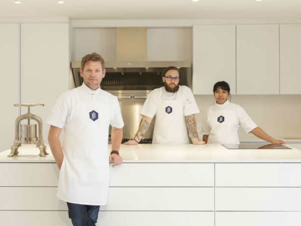 Michelin-stersjef en eienaar van Restaurant JAN in Nice, Jan Hendrik van der Westhuizen, Michael Jonker, hoofsjef en Andrea Pick, junior sjef by die studio. (Foto: Jac de Villiers)