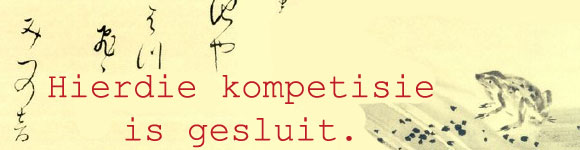 *Die organiseerders vra om verskoning vir ’n groot fout wat in die bekendstelling van hierdie kompetisie plaasgevind het. Professor Joan Hambidge het intussen uitgewys dat Eveleen Castelyn (1928-2004) die ongekroonde koningin van die haikoe in Afrikaans is. Ons vra om verskoning, en wil Joan bedank dat sy die fout uitgewys het. Gelukkig laat die digitale platform ons toe om dit sommer vinnig reg te stel.