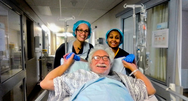 Humor is oorlewingstaktiek. Gerard por die verpleegsters aan om vinniger en vinniger die gange af te hardloop.