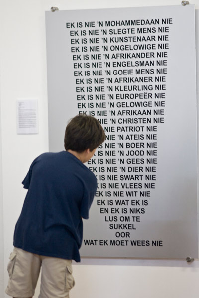 Feesgangers en kunstenaars wat kom na ’n fees toe soos die Absa KKNK, ervaar in ’n groot mate emosionele uiterstes as hulle teaterproduksies bywoon, so ek het gevoel die visuele program moet nie ’n neutrale intellektuele program wees nie, dit moet emosionaliteit wys sodat die feesganger met die werk kan identifiseer. Subjektiwiteit en emosionaliteit in die werk was vir my belangrik in die keuse van uitstallings. Die feesgangers het nodig om ’n emosionele konneksie te kan vorm met die werk – dit natuurlik sonder kitsch sentiment of ’n goedkoop vertoning van emosie.