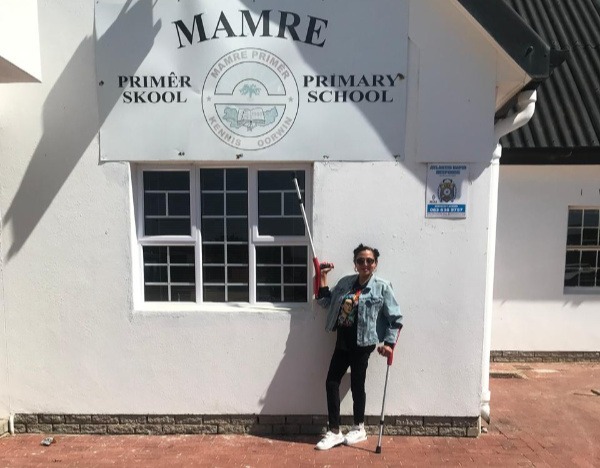 Marlene le Roux voor die Mamre Primêre Skool wat laas Vrydag in ’n mini-Kunstekaap-teater omgetower is. (Foto verskaf)