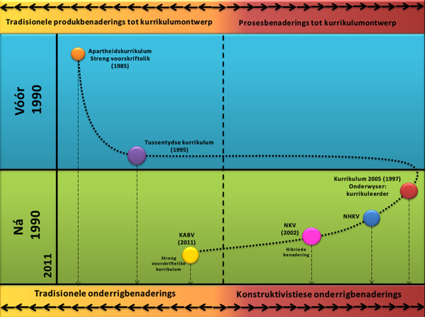 Die veranderings en herverpakkings wat die afgelope kwarteeu in die Suid-Afrikaanse skoolkurrikula voorgekom het, weerspieël die wisseling van die twee oorhoofse kurrikulumontwerpe: produk- en prosesbenaderings. Die veranderings weerspieël bepaalde tydruimtelike sosiopolitieke waardesisteme, ideologieë en besluite van die betrokke kurrikulumontwikkelaars deur die jare (Graham-Jolly 2012; Chisholm 2003:312, 316, 318).
