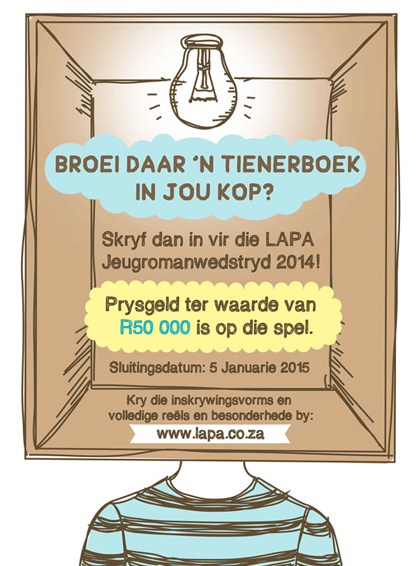 3. Die wenromans sal deur LAPA Uitgewers gepubliseer word. Deelnemers gee ook aan LAPA die eerste opsie om enige van die inskrywings te publiseer. Geen ingeskrewe verhaal mag elders voorgelê word/wees vir moontlike publikasie nie. LAPA sal ná afloop van die kompetisie skriftelik met alle deelnemers in verbinding tree om te bevestig of hul verhale gepubliseer word al dan nie.