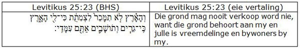 Die debat oor die betekenis van die term אֲחֻזָּה is ook al redelik op die spits gedryf. Die woord kom 20 keer24 in Levitikus voor waarvan 13 in hoofstuk 25 is. אֲחֻזָּה word dikwels teenoor נַחֲלָה afgespeel. Laasgenoemde term kom glad nie in Levitikus voor nie, maar word deur verskeie geleerdes as permanente erfgrond beskou wat aan ’n betrokke familie behoort. Daarteenoor word אֲחֻזָּה verstaan as ’n baie meer voorwaardelike en vervreembare verstaan van grondbesit wat dikwels in Duits met Nutzrecht vertaal word, met ander woorde die reg om grond te gebruik en nie te besit nie.25 Milgrom (2001:2173) vra waarom H konsekwent net אֲחֻזָּה gebruik, teenoor Deuteronomium, wat meestal נַחֲלָה gebruik, en beantwoord sy vraag dan as volg: “The answer is evident when it is noticed (and here Gerlemann [1977] is right) that H, alone of all the sources, insists on referring to Israel’s land as God’s land and Israel’s tenure on it as resident aliens (25:23).”