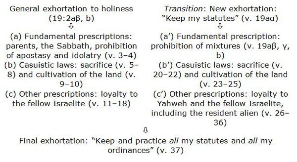 Lv 19 ist eine Summe von Geboten und Verboten sehr verschiedenen Inhalts und sehr verschiedener Form. Es ist zweifellos keine Einheit von Hause aus, wie der Wechsel von kasuistischen und apodiktischem Stil, von singularischer und pluralischer Anrede, auch der Wechsel der Schlußformeln zeigt.