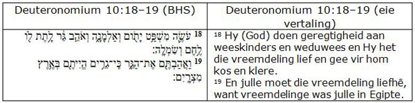 Die teks is baie anders as die ander twee, omdat dit begin met die stelling dat Jahwe geregtigheid doen (עשׂה) aan die weeskinders en weduwees en dat Hy die vreemdeling liefhet. Soos die Bondsboek noem hierdie teks al drie weerlose groepe, maar Jahwe se liefde word slegs op die vreemdeling betrek. Die liefde word ook konkreet uitgebeeld as die gee van kos en klere, wat herinner aan Hieke se definisie dat liefde ’n innerlike ingesteldheid is wat in sekere dade na vore kom. Eers dan word die aangesprokenes opgeroep tot liefde vir die vreemdeling. Dit is dus uniek dat die oproep tot liefde aan die vreemdeling voorafgegaan word deur die verklaring dat Jahwe die vreemdelinge liefhet,38 asof die teks ’n soort nabootsing van Jahwe van sy gehoor verwag (Ebach 2014:195). Maar, soos in die ander twee tekste, word ’n verdere motivering bygevoeg: dat die aangesprokenes vreemdelinge in Egipte was. Soos hier bo vermeld, is hierdie motivering uiteindelik die gemene deler in die drie tekste.