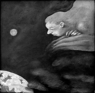 Die blik van die goddelike is afwaarts, na die aardbol toe. Die kunstenaar verdiskonteer ’n wetenskaplike wêreldbeeld van ’n draaiende aarde om sy eie as, maar vra die vraag uiteindelik oor waar só ’n wêreldbeeld die goddelike laat. Word die goddelike uitgeskuif na die buitenste duisternis? Laasgenoemde word veral beklemtoon deur die medium wat gebruik word, naamlik mestekenbord en die donker dele op die doek. Of is die goddelike besig om nader te kom met ’n meer vriendelike gesig?