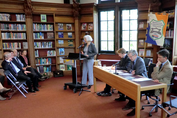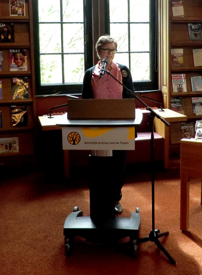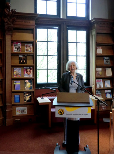Ena Jansen lewer die lofrede vir die vertaalster Riet de Jong-Goossens voordat die Van Riebeeck-erepenning aan haar in Amsterdam uitgereik is op 21 April.