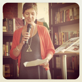 Die aandagtige gehoor volg Joan se voorlesing. |