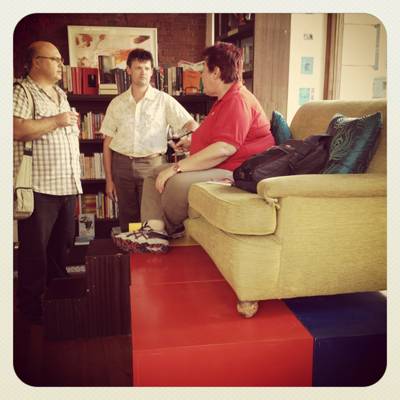 Joan het op ’n Mondriaan-geïnspireerde platform plaasgeneem vir die gesprek. Hier gesels sy vooraf met redakteur Etienne Bloemhof en reklame-koördineerder by NB-Uitgewers, Eben Pienaar. |