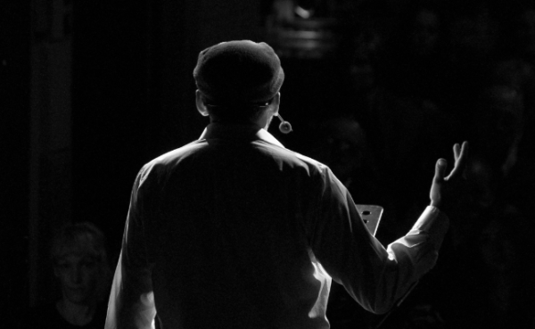 Soos wat sy telefoongesprek vorder en hy besef dat die koffiewinkel nou ’n teater is vir sy eenpersoonvertoning en sy selfgeskepte gehoor inderdaad na hom luister, so kry sy koffiewinkelopvoering ook momentum.