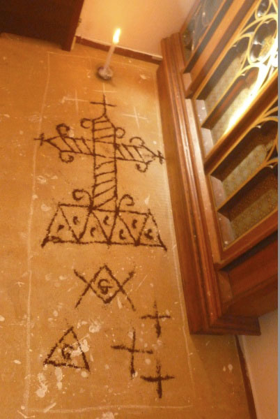 | "De grondtekening is een zgn. vévé, die gemaakt kan worden met koffie zoals deze, of met maismeel, of met steengruis, of nog anders. Er zijn honderden verschillende. Een priester of priesteres kent er vele uit het hoofd." – Maria van Daalen |