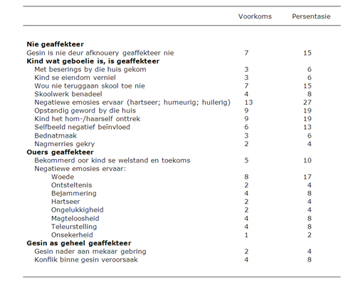 Soos aangedui in Tabel 1, het sewe deelnemers (15%) gemeld dat die afknouery nie hulle gesin geaffekteer het nie. Die meeste ouers het egter ervaar dat die krisis van afknouery hulle gesin op een of ander manier beïnvloed het. Die afknouery het die kind wat geboelie is, die ouers self, asook die gesin as geheel, geraak.