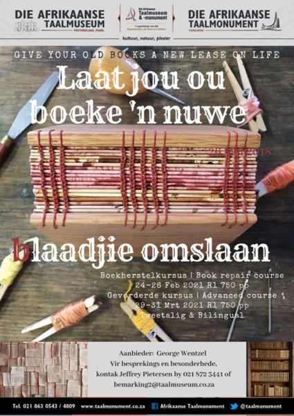 Jy is mal oor jou ou, verwaarloosde hardebandboeke, maar wens net jy kon die kuns bemeester om hulle met liefde reg te dokter? Dan is die boekherstelspesialis George Wentzel se kursusse by die Afrikaanse Taalmuseum en -monument (ATM) in die Paarl weereens die antwoord op jou drome. Wentzel, ’n gekwalifiseerde meesterboekbinder met meer as 45 jaar se ondervinding, bied ’n inleidende kursus oor die herstel van ou hardebandboeke van 24 tot 26 Februarie 2021 aan.