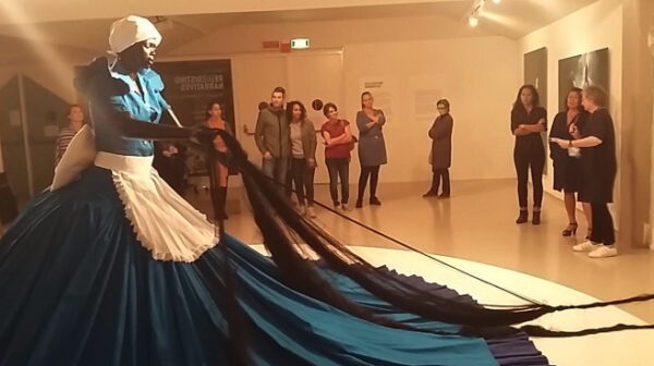 Ena Jansen trad met Soos familie, haar boek over het beeld van huiswerkers in de Zuid-Afrikaanse literatuur, een keer op tegen de achtergrond van een tentoonstelling van werk van de Zuid-Afrikaanse kunstenaar Mary Sibande – met haar typerende beelden van de huiswerker Sophie.