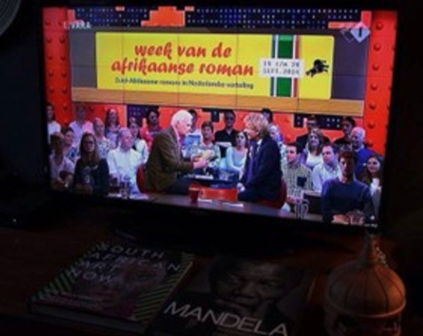 Adriaan van Dis (links) vertelt op de Nederlandse televisie over de Week van de Afrikaanse Roman
