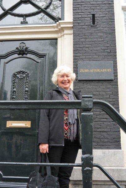 Irma Joubert op het bordes van het Zuid-Afrikahuis, Amsterdam
