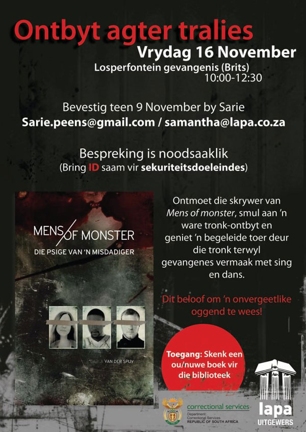 LAPA het pas die boek Mens of monster, die psige van ’n misdadiger gepubliseer. Lesers kry ’n geleentheid soos min: om te sien wat regtig elke dag agter die tralies gebeur. Daar vind op Vrydag 16 November ’n unieke boekbekendstelling plaas soos wat min nog beleef het – in die Lospergevangenis in Brits.