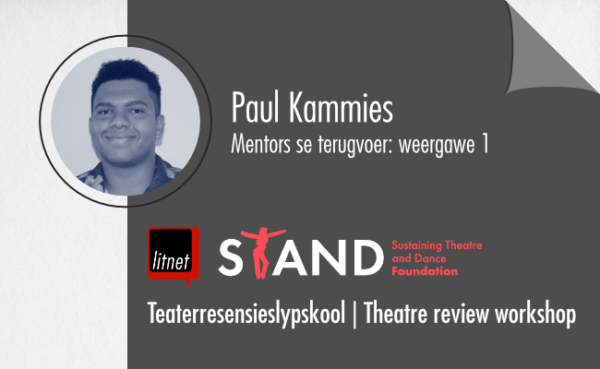 Hierdie mentorsterugvoer vorm deel van die LitNet | STAND-teaterresensieslypskool. Die tien deelnemers skryf elkeen ’n resensie waarop die mentors dan terugvoer gee. Daarna gaan hulle kans kry om weer aan hul resensies te werk, nog terugvoer van die mentors te ontvang en dan hul resensies finaal af te rond.