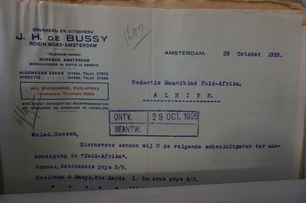 Die Uitgewery JH de Bussy was ’n uitgewery met ’n eie drukkery in Amsterdam. Dit lyk asof daar ook ’n affiliaal van die uitgewery en drukkery in Kaapstad was, plus boekwinkels in Pretoria en Kaapstad – soos reeds in die inleiding genoem. Wat digitaal duidelik geword het in Zuid-Afrikahuis, is dat die Nederlands-Zuid-Afrikaanse Vereniging (NZAV) al in 1917 aangekondig het dat hulle die gesamentlike boekwinkels van De Bussy in Suid-Afrika wil verkoop. Kyk na die aankondiging bo-aan op die volgende foto en die leêr in die depot met die inventarisnommer 1803.